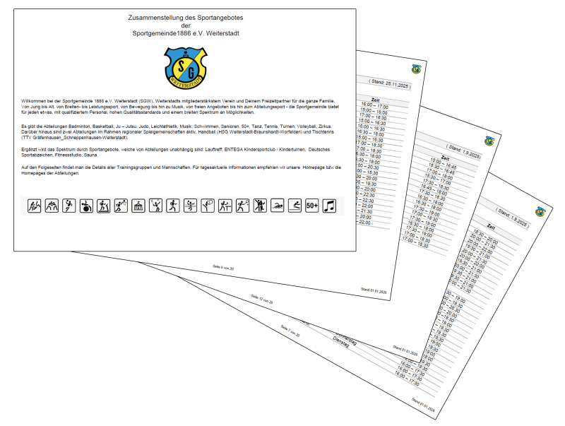 Eine aktuelle Übersicht über alle Angebote, die Details zu Trainingsgruppen und Mannschaften der Abteilungen sowie den übergreifenden Sportbereichen findet man hier im Download.